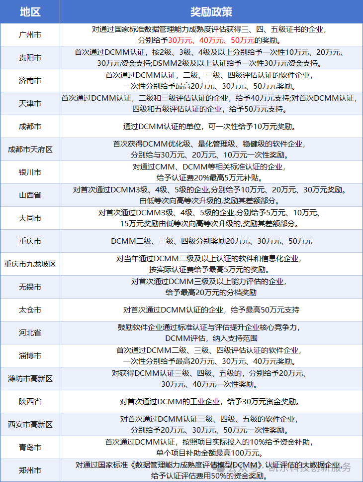 (1)直接獎勵:廣州對通過DCMM五級以上企業(yè)給予最高50萬元補(bǔ)貼