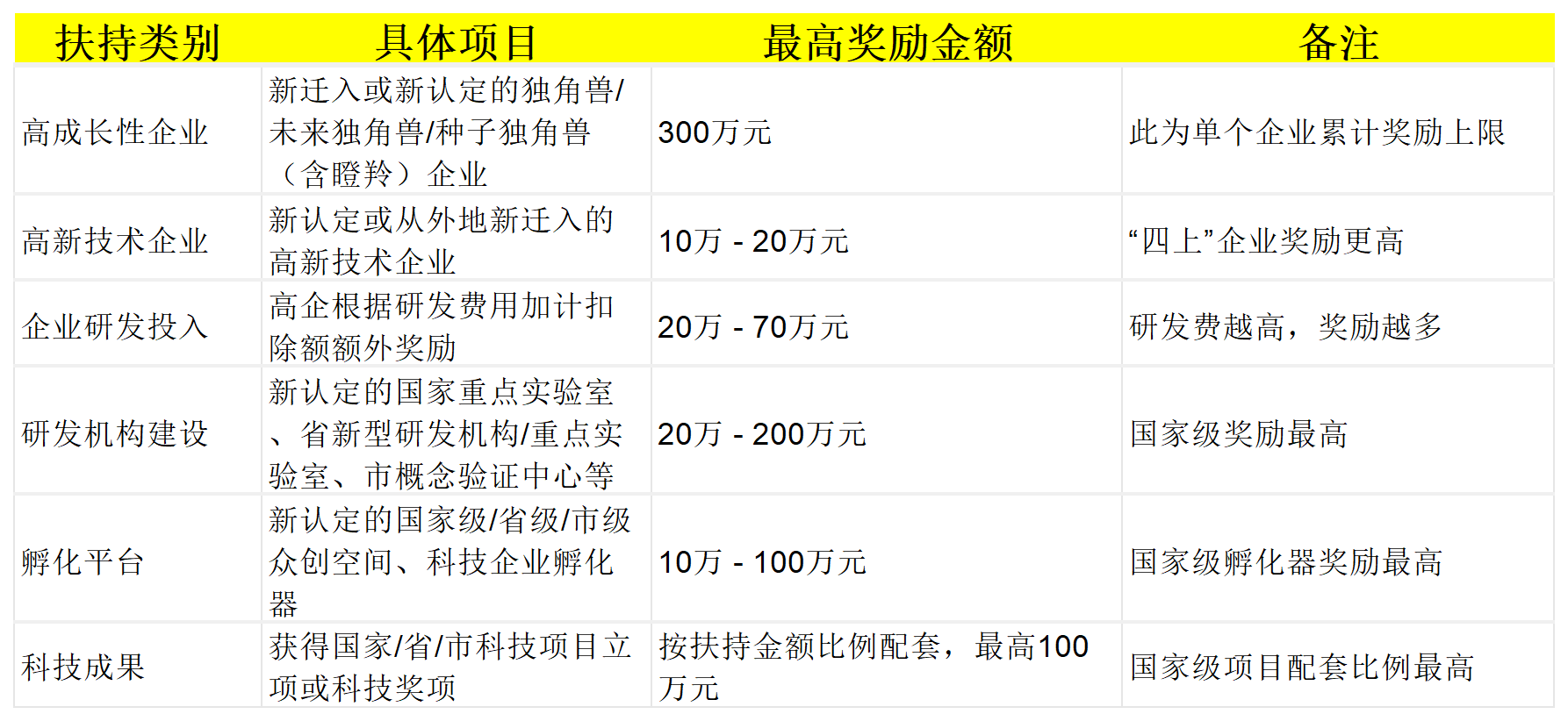 2. 主要扶持對象與獎勵標準:政策為不同類型的企業(yè)和創(chuàng)新平臺提供高額資金獎勵,主要類別和最高獎勵如下: