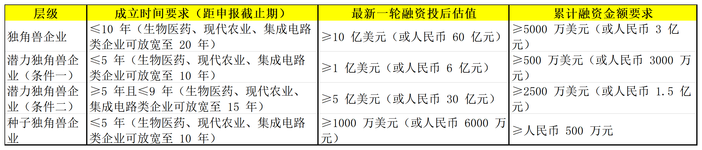 (1)非上市公司控股并表的企業(yè),尚未在境內(nèi)外股票市場(chǎng)(新三板及境內(nèi)外場(chǎng)外交易市場(chǎng)除外)上市;(2)獲得私募股權(quán)投資或產(chǎn)業(yè)投資(種子獨(dú)角獸企業(yè)需滿足對(duì)應(yīng)累計(jì)融資金額要求)。
